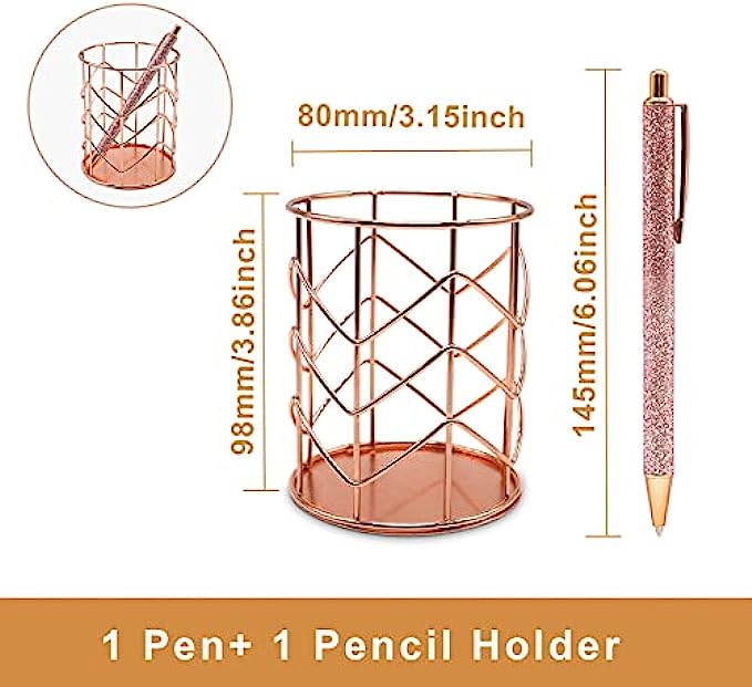 【Specification】 the gold stapler size:6.14 x 1.41x 2.56 inch; Tape dispenser size:4.88 x 1.41 x 2.64 inch; Staple Remover size is 2.36x 0.61x 1.57inch; Binder Clips szie is 0.75x 0.35inch; Pencil Holder size is 3.15x 3.86inch, all rose gold rose gold tape dispenser and stapler are regular size for office desk use.
