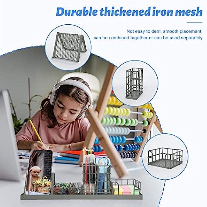 Grey Desk Organizer for School and Office - 7 Piece Desk Accessories Set- Pencil Holders, Clip Storages, Sticky Note Tray and Phone holder, Customizable Storage - Office Supplies Stationery Décor
