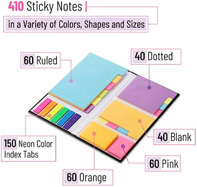 Each sticky notes set includes 60 Ruled (3.8x6’’), 40 Dotted Notes (3x3.8’’), 40 Blank (2.6x3.5’’), 60 Orange and Pink, 150 Neon Color Index Tabs, 410 Total Tab Divider Notes