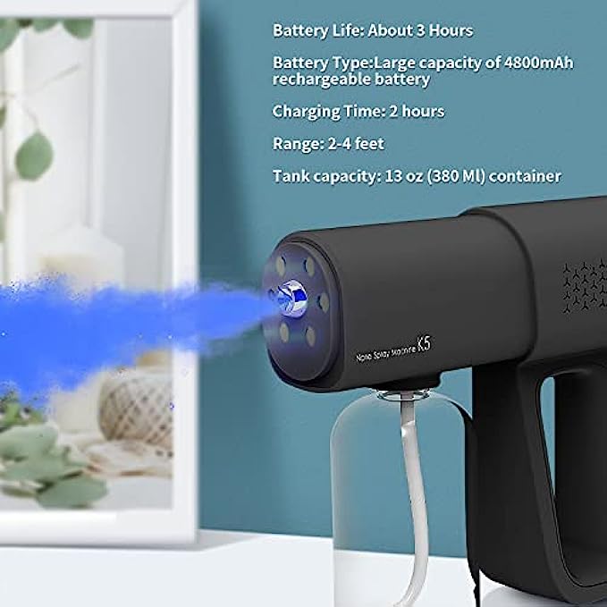 • 【Handheld Wireless Fogger】You can easily clean full rooms in under 5 minutes. More effective than manual hand wiping, pump spraying or mopping. The spraying range is about 2-4 feet. Nano sprayer gun can be sprayed directly on the surface of the human body, fabrics, home appliances and other objects.