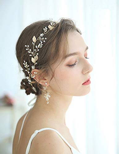 Aimimier Bridal Hair Vine Crystal and Pearl Headband Gold Leaf Headpiece for Bride Bridesmaid Handmade Hair Accessories for Women