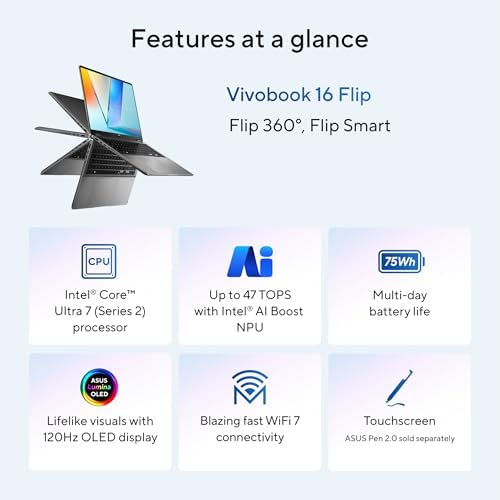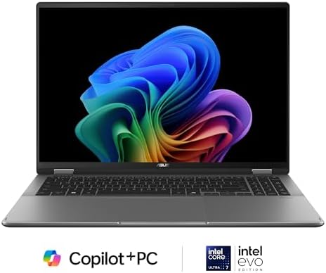 Vivobook 16 Flip Laptop, Copilot+ PC, 16” OLED 3K 120Hz Touch Display, Intel® Core™ Ultra 7 256V, Intel® Arc™ Graphics, 16GB Memory, 512GB SSD, Matte Gray, TP3607SA-DS74T