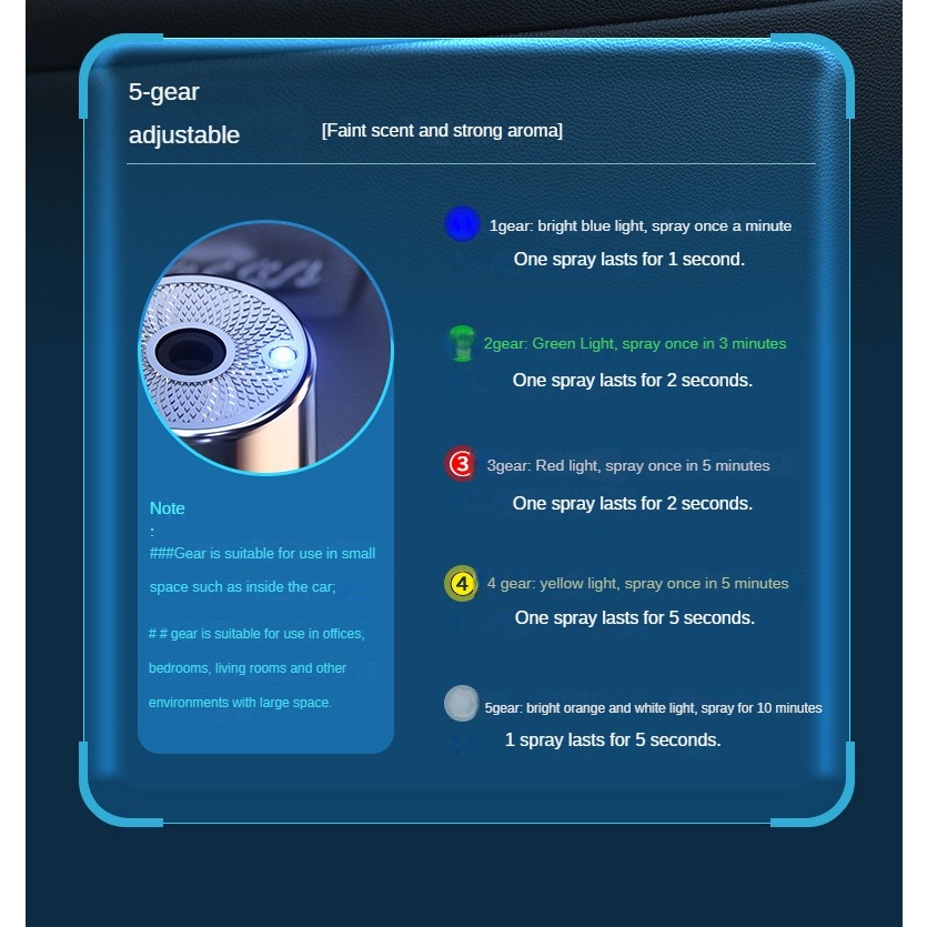 Suitability:10/10 Appearance:10/10 Quality:10/10 Im very pleased with this product. It has 5 selection of mode. 1st - 3rd mode is for smaller space like car. 4th & 5th mode is for larger space area. At the end is how frequent you want your diffuser to spray. Aesthetically looks great.