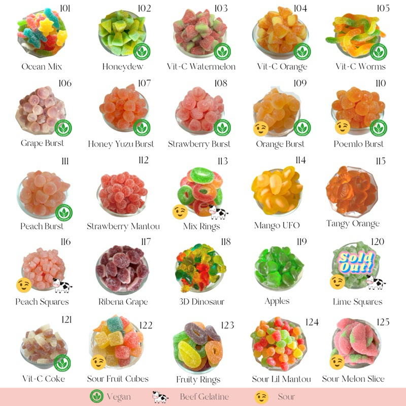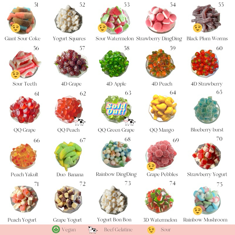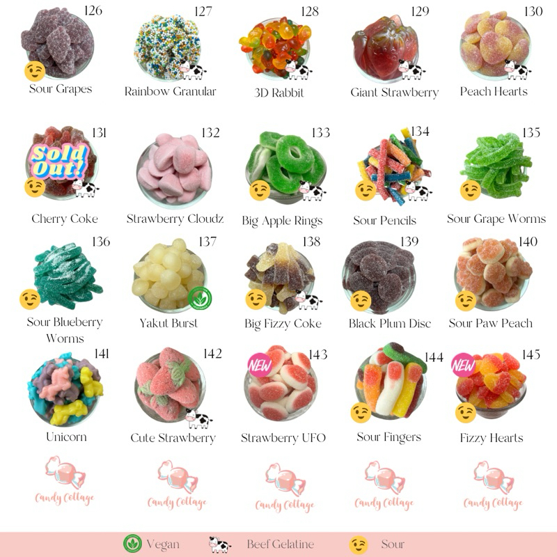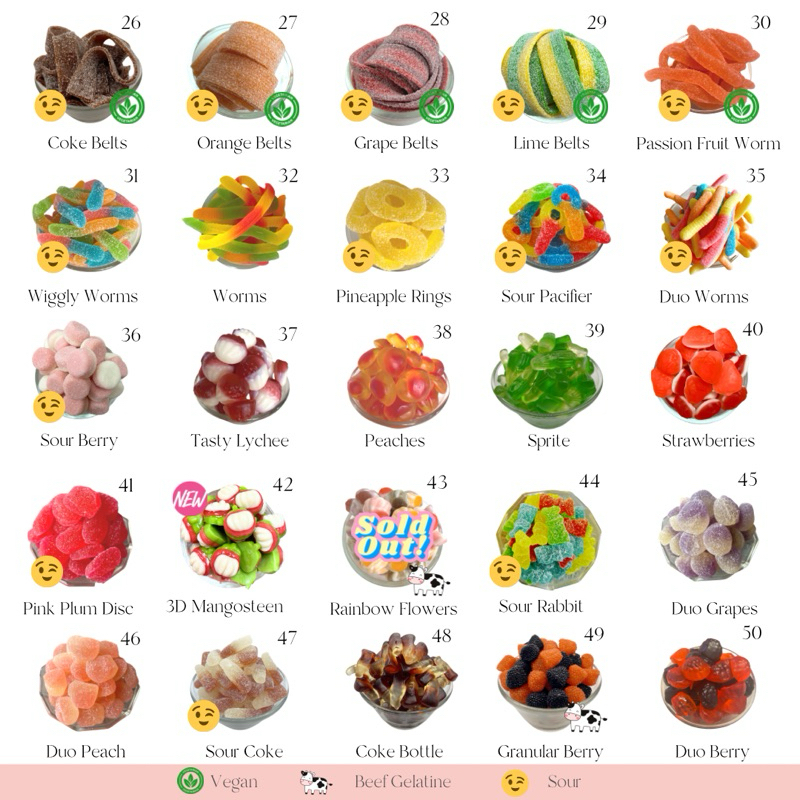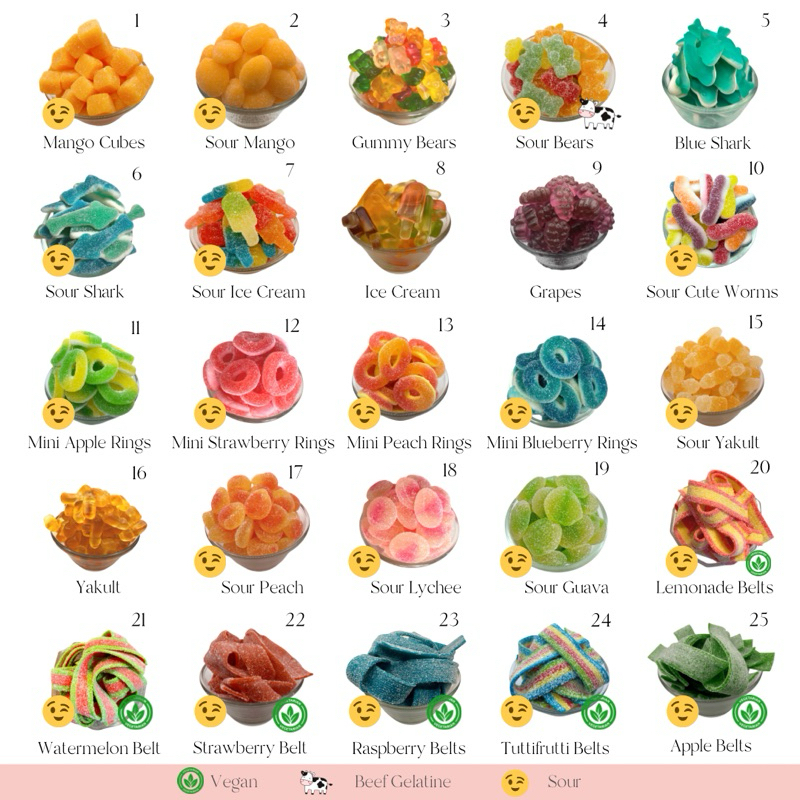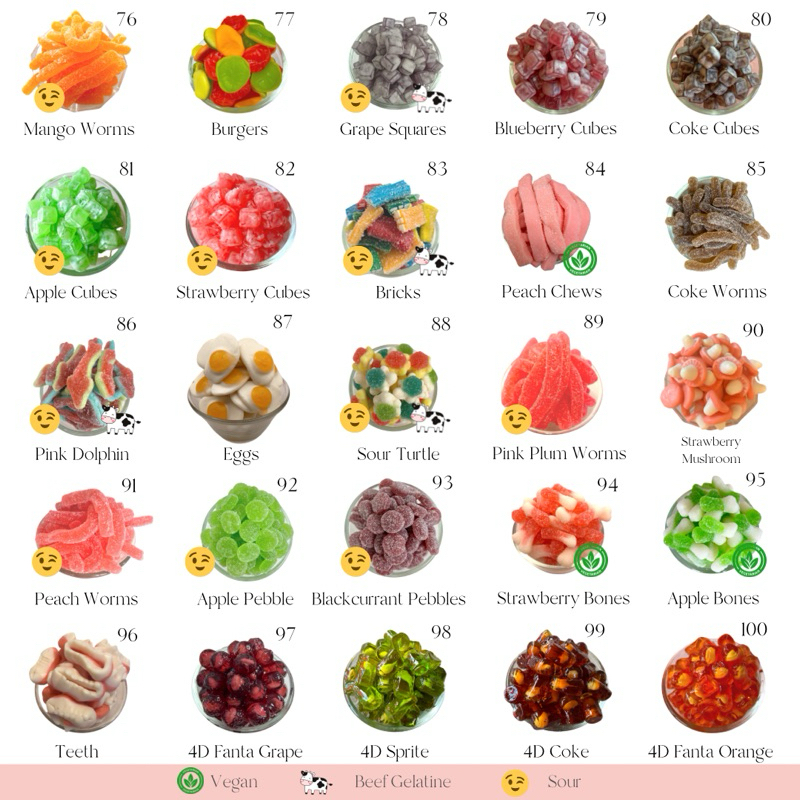 2-sour mango: sour, mango smell and taste very good, but not very chewy 7-sour ice cream: a lot bigger than expected lol, sour 11-mini apple ring: so good 13- mini peach ring: so good 47-sour coke: taste like what you expect, good 98-4D sprite: not very sprite 35-duo worms: sour, nice 117-ribena grape: sweet, very very very diluted grape flavour