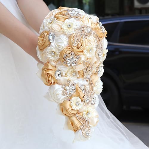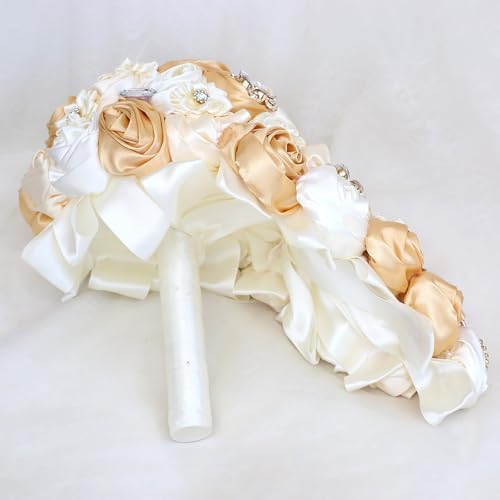 Sponsored Ad - Cascade Wedding Bridal Bouquet Silk Rose Artificial Flower Bride Holding Toss Bouquets Beaded Rhinestone Crystals Pendant Waterfall Drop Flowers Bunch Light Khaki and Ivory 8.7 Inch