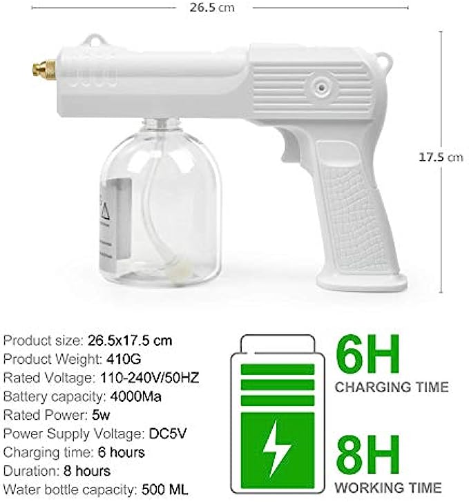 • Rechargeable Sprayer: 2600mAh lithium battery powered wireless nano electric gun, 2H charge, continuous working time up to 3H! 110V-240V universal rated voltage, safe and convenient.