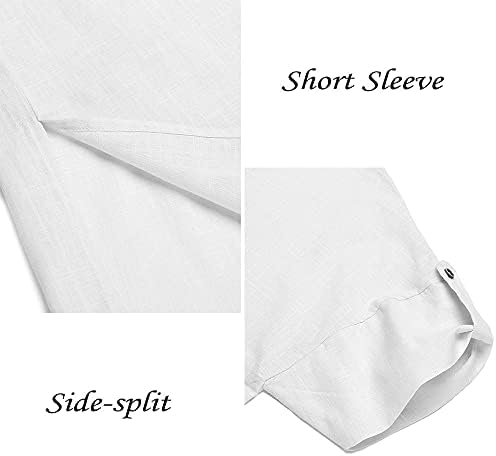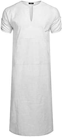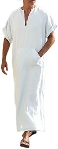 Men's V-Neck Linen Robe Short Sleeve Kaftan Thobe Long Gown Casual Shirt for Beach, Summer
