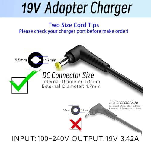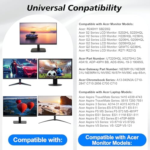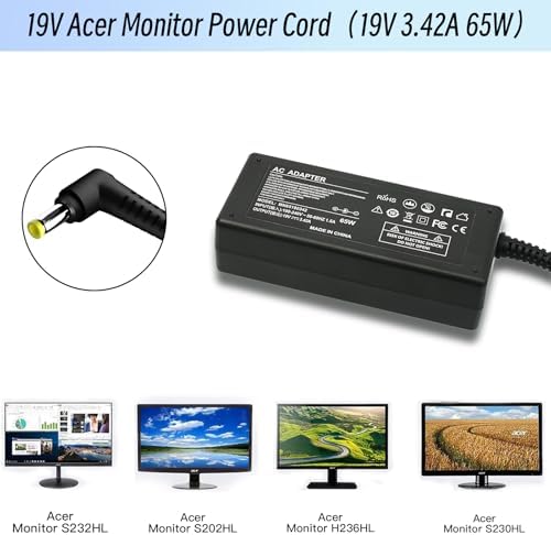 19V Power Cord Compatible with Acer Monitor R240HY SB220Q SA230 S231HL S232HL H236HL S202HL S230HL S240HL S220HQL S271HL S241HL G246HL G276HL G226HQL G236HL Power Supply AC Adapter 65W