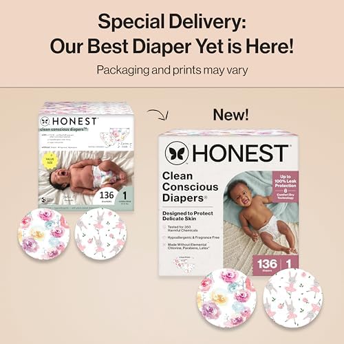 Sponsored Ad - Clean Conscious Diapers for Sensitive Skin, Up to 100% Leakproof Hypoallergenic Fragrance-Free Baby Diapers, Girl Prints, Super Club Box, Size 1 (8–14 lbs), 136 Count