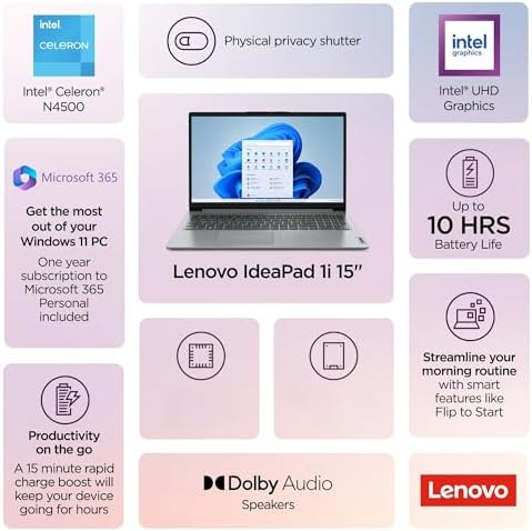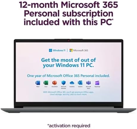 IdeaPad 1i Laptop with Microsoft 365 Home and Business • 12GB RAM • 1TB Cloud Storage and 256GB SSD • Intel Core • 15 Anti-Glare Screen • WiFi-6 • 11HR Battery • Windows 11 • w/o Earbuds