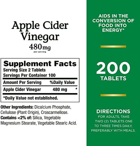 Apple Cider Vinegar 480mg Pills, Vegetarian Supplement Plant Based, 200 Tablets