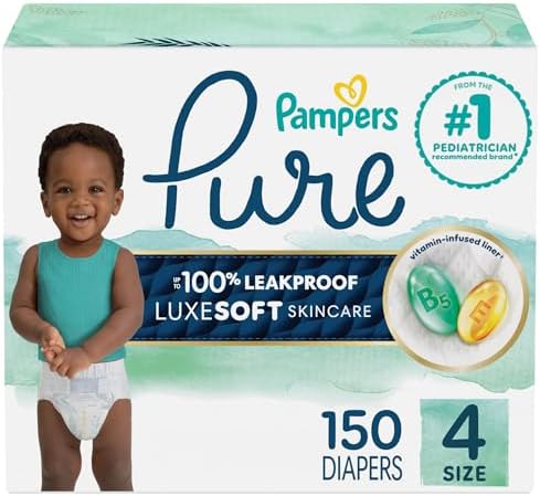 Pampers Pure Protection Baby Diapers, Size 4, 150 Count, Up to 100% Leakproof, Premium Plant-based Skin Protection, Hypoallergenic Soft Diapers