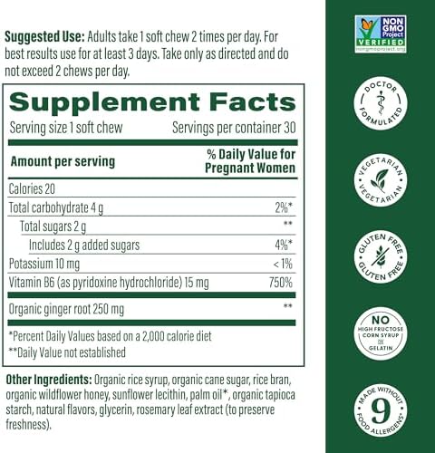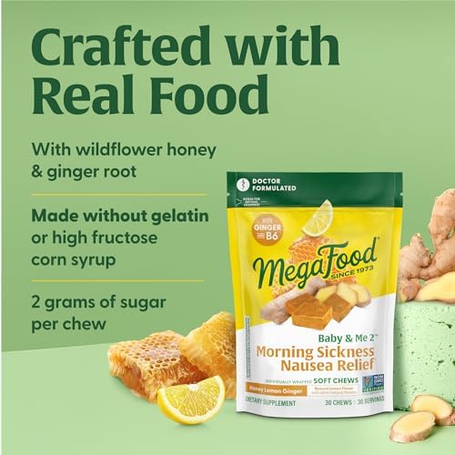 MegaFood Baby & Me Prenatal Morning Sickness Relief, Ginger Chews, with Vitamin B6, Made Without 9 Food Allergens, Honey Lemon Ginger Flavor, 30 Chews