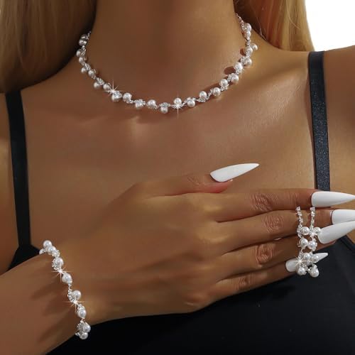 Silver Rhinestone Pearl Necklace Sets for Wedding Brides Bridesmaid Crystal Necklace Earrings Bracelet Set Sexy Pearl Collar Necklace Elegant Pearl Earrings Bracelet Sets for Women Costume Accessories