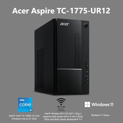 Aspire TC-1775-UR12 Desktop | Intel Core i5-14400 10-Core Processor | 16GB 4800MHz DDR5 | 512GB M.2 2280 PCIe Gen 4 SSD | SD Card Reader | Intel Wi-Fi 6E AX211 | Windows 11 Home