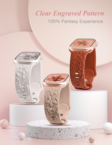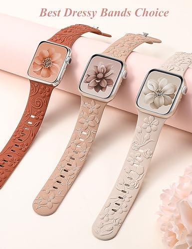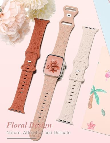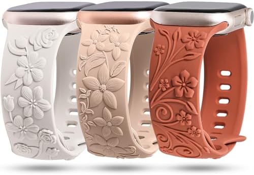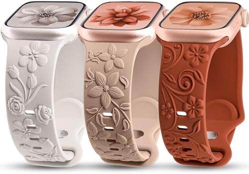 3 Pack 3D Floral Embossed Bands Compatible with Apple Watch Band 38/40/41/42/44/45/46/49mm Women, Engraved Soft Silicone Flower Cute Dressy Straps for iWatch Series 10/9/SE/Ultra/8/7/6/5/4/3/2/1