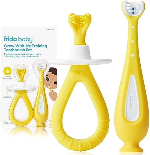 Frida Baby Grow-with-Me Baby Toothbrush Training Set | Infant to Toddler Toothbrush 0-12 months, Cleans All Sides at Once, Oral Care for Sensitive Gums | Yellow