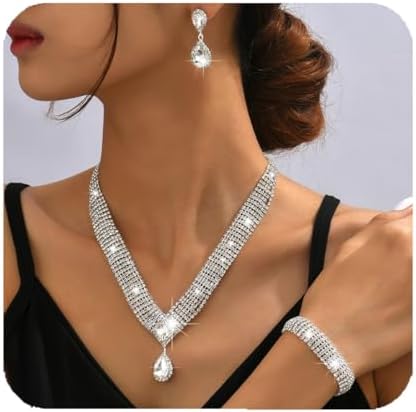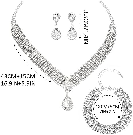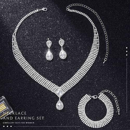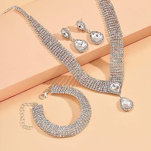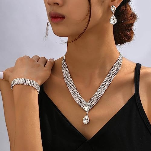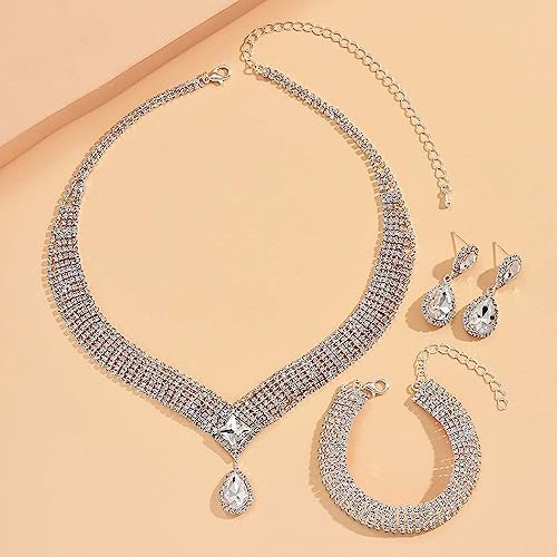 Unicra Crystal Bridal Wedding Jewelry Set Silver Teardrop Necklace Earrings Bracelet Sets Rhinestone Prom Jewelry Accessories for Women and Brides