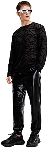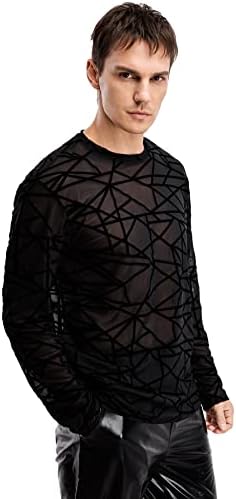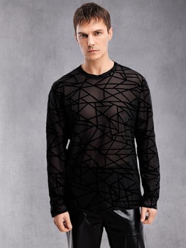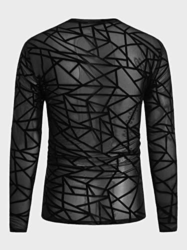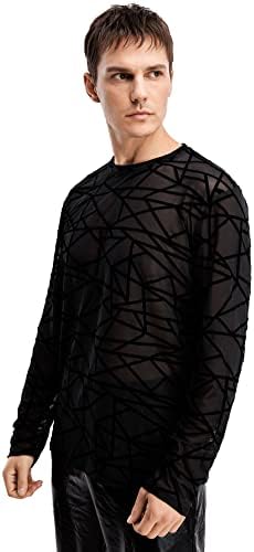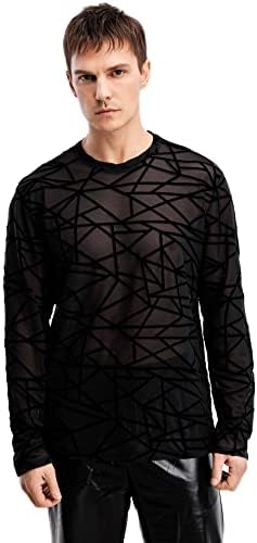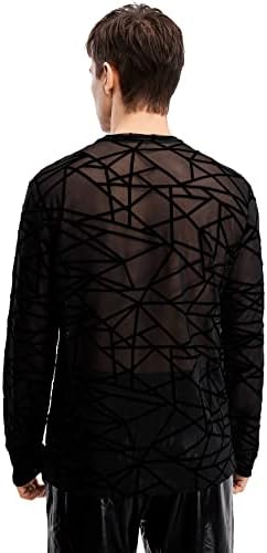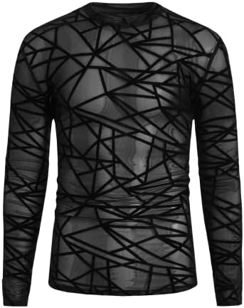 Men's Striped Mesh Sheer See Through Long Sleeve Round Neck Party Top
