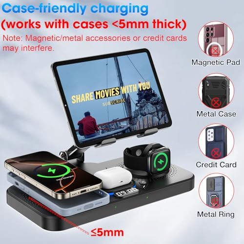 6 in 1 Wireless Charger for Apple Device, 30W Foldable Wired Charging for ipad with Clock & 7 Color Ambient Light, Nightstand Charger Station for iPhone 17/16/15/iWatch Series/AirPods 4/Pro 3(Black)