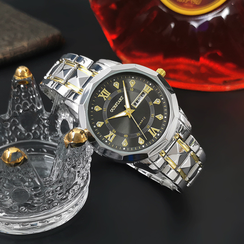 [With Box]POSHI Fashion Business Stainless Steel Luxury Mens Gold Watch Luminous Waterproof Automatic Date Swiss Quartz Wrist Watch for Men